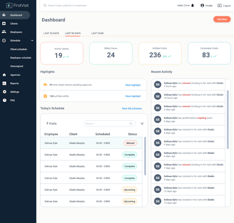 Home care agencies can utilize FirstVisit to automatically collect and document clients' information including care plans, custom activities of daily living (ADL), reports, notes, and more. It provides a payroll module, which lets HR managers maintain automated timesheets for clients or caregivers and review past visits for billing purposes. It also offers a GPS-enabled application for caregivers to clock-in/out, respond to vacant visit requests, record tasks, and verify home visits through electronic visit verification (EVV) methods.