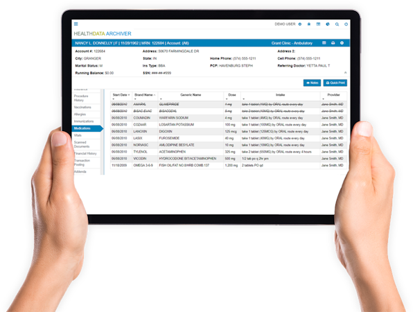 • HealthData Archiver indexes all migrated and scanned data, and makes it searchable by name, social security number, account/patient identifier, and data source.