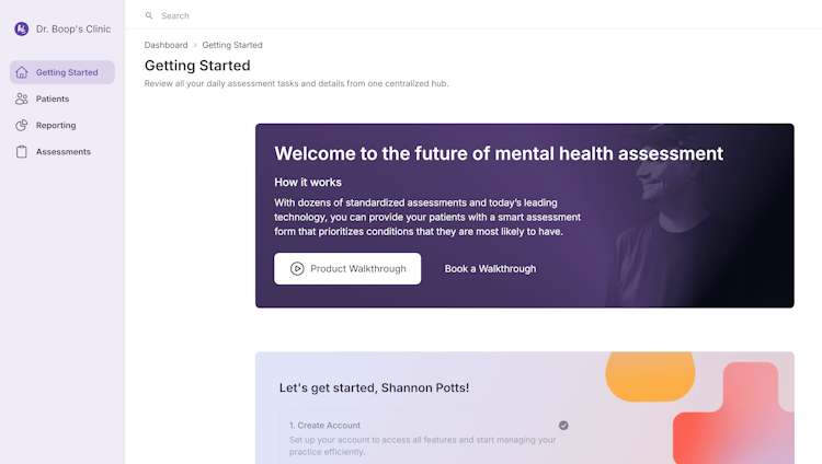 The platform features an intelligent assessment framework with automatic scoring and real time comorbidity detection. Its algorithm analyses response data, identifies symptom patterns and suggests follow up assessments for comprehensive evaluation. The system applies artificial intelligence recommendations to highlight potential comorbidities and generate clinical notes that minimize documentation burdens. The user interface is optimized to reduce questionnaire fatigue and sustain patient engagement across devices through mobile assessments delivered via email, text or QR code. A centralized dashboard enables real time client tracking and supports instant report exports in PDF format for clinical and administrative stakeholders.