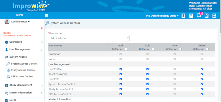 ImproWise is a comprehensive clinical trial management platform that combines multiple functionalities into a single end-to-end web-based solution for clinical research organizations. The system integrates Clinical Trial Management System, Clinical Data Management System, Electronic Data Capture, Clinical Trial Budget Management, Clinical Trials Project Management, Electronic Trial Master File, Electronic Patient Reported Outcome, and Role-Based Access Control System into one cohesive platform. Designed for various stakeholders in clinical trials, including sponsors, investigators, data managers, data entry specialists, site staff, and regulatory affairs professionals, ImproWise serves pharmaceutical companies, CROs, trial sites, clinics, hospitals, independent medical examiners, and medico-legal service providers.