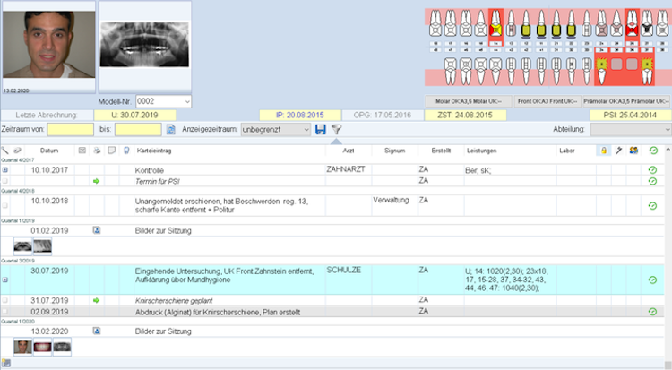 ivoris dent supports dental practices in their operational processes. A patient file is available for this purpose, and all treatment processes are recorded chronologically. In addition, ivoris dent enables the scientifically oriented documentation of all results. An automatic conversion feature for cash accounting means this process takes place in the background. At the same time as the dental assessment, dentists and dental assistants can enter BOP and PUS.