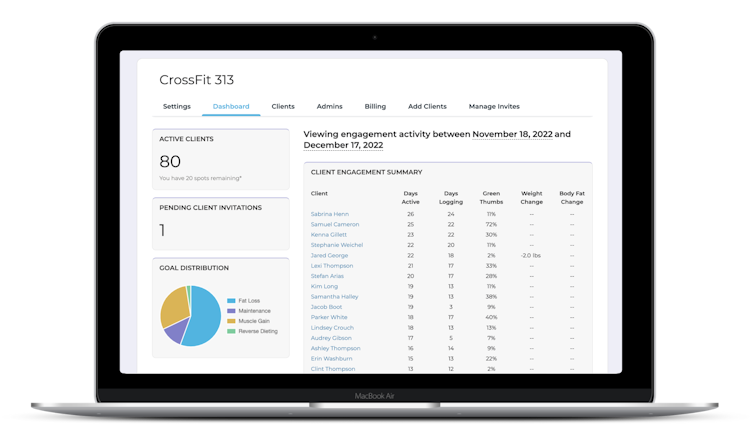 • Client insights: The dashboard provides business owners with both high-level as well as detailed insight into client progress, so they can easily see who is reaching their goals and who needs more help.
