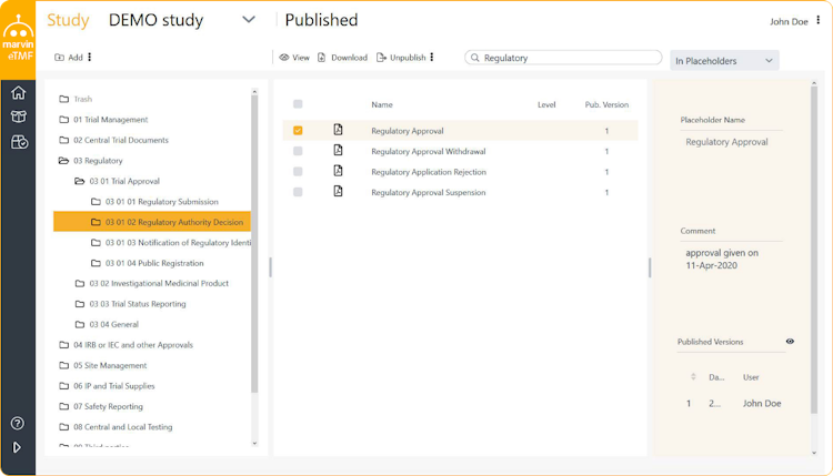 Administrators can record metadata and retrieve documents for audit trail and versioning in a unified interface. Marvin eTMF allows supervisors to configure role-based access among employees, manage approval workflows, and search files based on name, size, type, and upload time. Operators can also utilize the drag-and-drop interface to upload documents across specific locations.