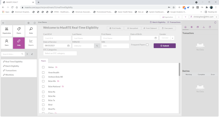 Healthcare providers lose substantial revenue every year due to non-payment or failure to collect from self-pay patients. maxRTE provides insurance eligibility verification and discovery software that helps providers identify unknown insurance and collect more revenue, at a lower cost, in a shorter time frame. Flat-rate monthly pricing enables providers to process any number of transactions with unlimited users.