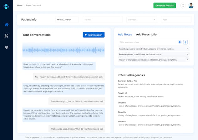 The software features a real time voice to text transcription engine that produces comprehensive medical notes with high accuracy. A customizable potential diagnosis option can be enabled or disabled to match individual clinical protocols and preferences. An automated prescription generator analyzes transcribed conversations to extract relevant information for precise medication orders. The solution generates detailed clinical reports that include hospital or clinic details, physician signatures, SOAP notes and progress summaries to support complete documentation.