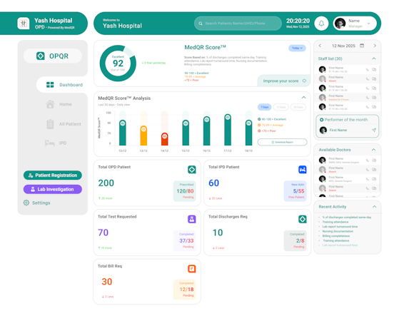 The solution comprises specialized modules tailored to distinct healthcare functions. OPMedQR orchestrates the outpatient care continuum from appointment scheduling through follow-up consultations and incorporates tools for patient flow optimization and queue oversight. IPMedQR manages inpatient admissions, bed assignment, occupancy monitoring and discharge coordination with features to accelerate bed turnover. BillMedQR facilitates transparent billing for outpatient and inpatient services, generates cost estimates, tracks receivables and presents revenue data through financial dashboards. LabQR digitizes diagnostic workflows with configurable templates, DICOM imaging review, instant result notifications and report management. MediQ streamlines pharmacy and inventory control with digitized stock tracking, prescription processing, pilferage prevention mechanisms and automated stock level alerts. Built-in compliance tools include registers, consent logs, audit trails, infection control dashboards and traceability measures aligned with NABH and ABDM standards. The platform extends post-discharge engagement through remote consultation capabilities and real-time health monitoring.