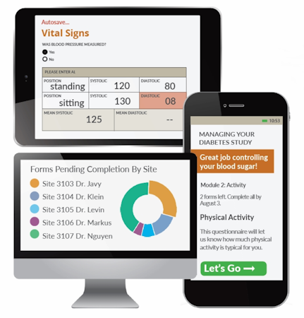 • Patient reported outcomes, ePRO and eCOA, is supported by study participant engagement across devices, with the ability to send gentle SMS and email reminders to submit due data.