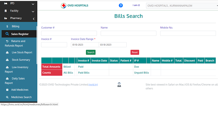 OVID HMS offers customized branding for all printouts, document management, drug dictionaries, price configuration for all charges, customizable lab test parameters, detailed discharge summary and facility management.
