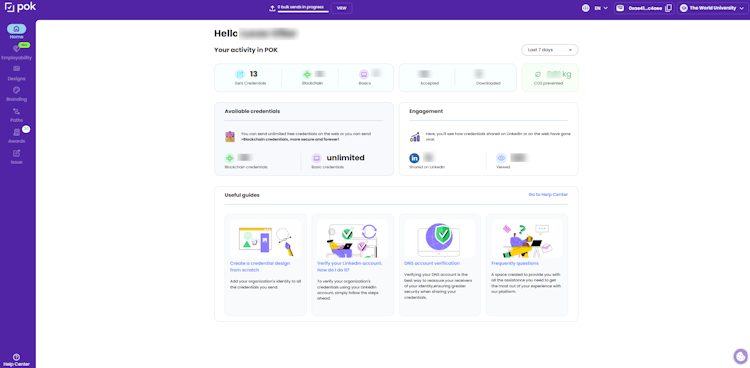 POK is a blockchain-based platform that enables institutions and organizations to issue verifiable digital credentials and microcredentials as NFTs. The system provides a white-label solution that allows complete customization of digital certificates, domains, and emails to match an organization's branding while maintaining compliance with global standards including OpenBadge 3.0, European Learning Model, GDPR, LTI, and Europass. These credentials are secured through decentralized blockchain technology, making them uniquely identifiable, tamper-proof, and globally verifiable with a single click.