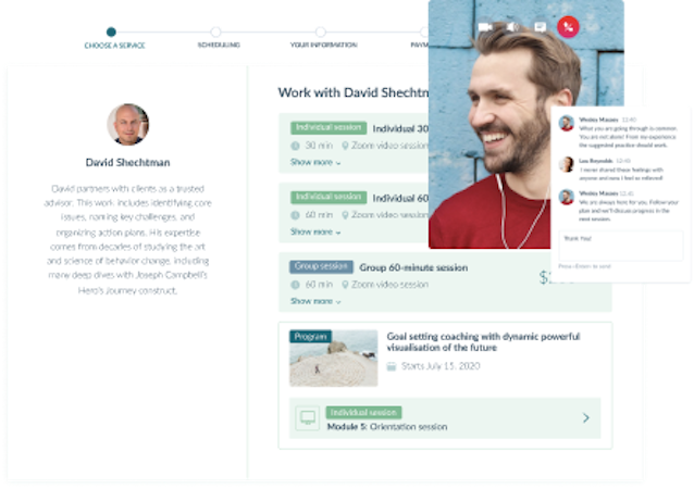 Schedule and run individual and group sessions with clients, sell courses, take client payments, track client progress, build a community, and more.