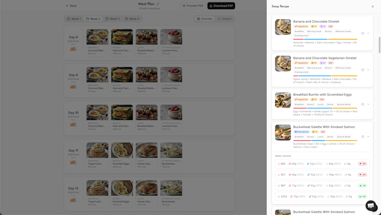 The system operates on a constraint based algorithmic engine that processes detailed client parameters to generate customized meal plans. It supports dietary profiles across omnivore, vegetarian, vegan, and pescatarian categories and manages granular allergy and intolerance exclusions for more than one hundred ingredients. A unique feature is ingredient form personalization, which accounts for preparation states and methods such as fresh versus cooked produce or grilled versus fried proteins. The platform accommodates cooking appliance constraints including stovetop, air fryer, and microwave, and filters recipes by food processing classification and grain type specifications.