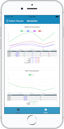 Patients can use the mobile app as a self service platform to complete surveys, receive reminders for incomplete surveys, and track scores. Each patient is awarded a score for each completed survey and the results reports contain relevant scales and sub-scales. Mental health professionals can drill down on survey scores to assess where further work is needed and where patients are progressing.
