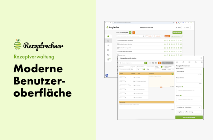 The system comprises seven integrated modules accessible through a single account. The recipe management module stores recipes in a cloud database with both web and mobile access, featuring search functions and customizable categorization. Nutritional value calculations draw on the Bundeslebensmittelschlüssel database containing more than ten thousand ingredients and allow the addition of custom entries with user-defined nutritional data. The label generator produces legally compliant nutrition tables and ingredient lists in the order required by regulation, supports QUID labeling and inclusion of storage instructions, and enables export as image files or printable PDF documents. Allergen and additive declarations are suggested automatically and can be reviewed and adjusted manually, with allergens highlighted in bold across all outputs.