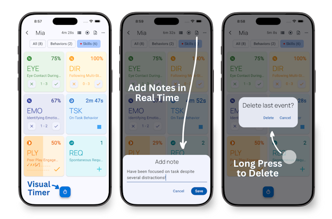 Practitioners collect data using all nine standard recording methods: frequency with tally counter, duration and latency timers, partial and whole interval recording, percent correct with prompt tracking, ABC data, task analysis with configurable prompt hierarchies, and momentary time sampling. Data entry is designed for one hand - tap to record, long-press to revert mistakes, switch between up to 10 student sessions without closing anything.