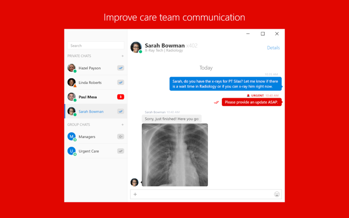 Key features of Trillian include an employee directory, telephony, private chat, file sharing, and patient records management. Read receipts functionality displays the time messages were read, eliminating the need to send follow-up messages. Care teams can send urgent messages with notifications to users marked as do not disturb, or on mute.