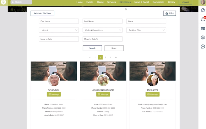 Viibrant allows staff members to sort events into custom categories based on multiple criteria, including shopping, dining, health and fitness, theatre, testing, movie, and more. It offers internal employee and resident directories, which allow users to search for specific individuals, access contact details, view individual interests, and establish two-way text-based communications from within the unified platform. It also lets residents make dining hall reservations, access menus, place takeaway orders, and raise service or maintenance requests.