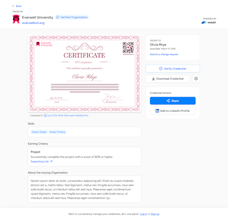 Wauld is a digital credential management platform that enables organizations to design, issue and verify digital certificates and badges within an end-to-end credentialing system. It manages the complete lifecycle of digital credentials from initial creation to distribution and ongoing verification. This platform addresses the needs of higher education institutions, training providers, coaches, content creators and membership associations seeking secure and verifiable methods for recognizing skills, achievements, affiliations and compliance certifications.