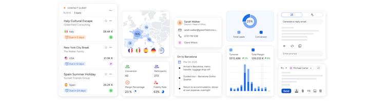 The platform delivers a comprehensive suite of integrated modules tailored to travel business requirements. At its core Caladeo offers a built-in customer relationship management module with pipeline visualization that centralizes contacts, opportunities and tasks while providing a unified view of clients, prospects and service providers. The itinerary creation functionality enables assembly of customized travel packages by combining catalog elements such as stages, products, accommodations and insurance with automatic budget calculation and margin management. The quoting tool generates professional, customized proposals in PDF and online formats. The financial management module streamlines client invoicing, supplier invoice processing, payment tracking and value added tax management. Integrated email features and artificial intelligence tools support content creation, translation and communication within the same environment.