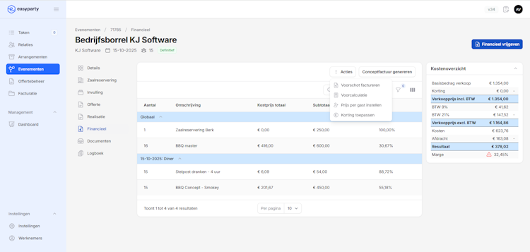 The system integrates with supplier catalogs and automate purchase orders based on event demand. Users can generate invoices from confirmed orders, with real-time margin and cost calculations. EasyParty integrates with accounting software (e.g. Exact Online, Twinfield), point-of-sale systems, and calendar tools.
