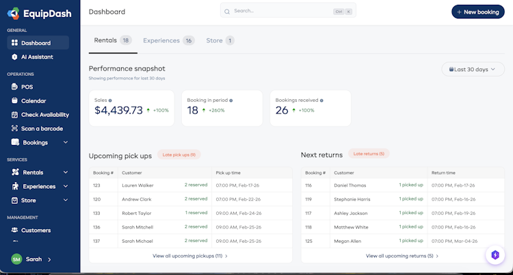 EquipDash is an AI-based booking and operations management platform designed for equipment rental providers and tour and experience operators. The software enables teams to consolidate booking management, inventory tracking, staff scheduling, payment processing, digital waiver collection and customer relationship management into a unified dashboard. The solution serves businesses in outdoor recreation and tourism sectors such as ski and snowboard rental shops, bike rental operations, water sports equipment providers, boat rental companies, camping and hiking gear outfitters, tour operators, activity and adventure enterprises, attractions and charter services. The platform lets stakeholders accommodate pure equipment rental, pure tour and experience models or a hybrid approach.