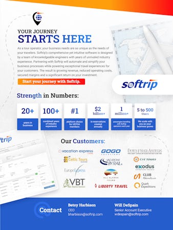 Originally built within Gate 1 Travel, Softrip offers one comprehensive and "source of truth" platform for multi-day tour operators. Our expansive suite of products includes Reservations, Product Management, Operations , CRM & Marketing, Reporting & Task Management, Integrated Payments, and Accounting modules. We also offer best-in-class integrations into the leading GDS systems.