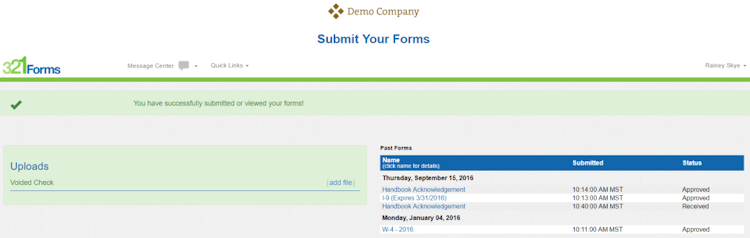 321Forms enables employees to enter their details once, in a custom questionnaire, and populates that information across recurring fields in multiple forms, including I-9, W4, and benefits forms. Forms can also be pre-filled with company information, such as address fields and FEINs (Federal Employer Identification Numbers). Digital files in 321Forms are designed to only accept specified information, preventing employees with incomplete or incorrect information from progressing through the onboarding process. Employee signatures can be captured electronically, and integration with E-Verify enables the checking of employees’ work eligibility.