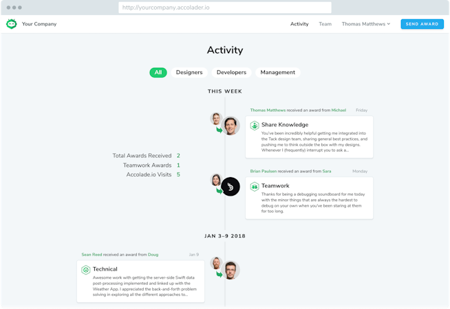 Accolader was created to enable team members to recognize the achievements of their peers. While other products award employees with points, gift cards, or even cash, the most rewarding award is the respect and recognition from others on your own team. It is this philosophy that drives Accolader.
