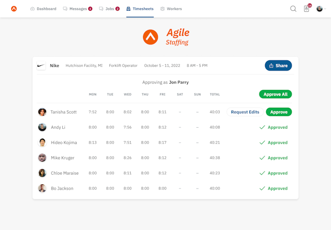 Recruiters have multiple channels to engage candidates in SMS, in-app chat, and email plus geo-fenced tracking to monitor their jobs and ensure accurate clock-in information. With less time spent searching for candidates, updating their information, and contacting them for jobs, recruiters can spend more time on relationship building and business goals.