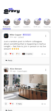 • The chat and newsfeed lets everyone stay connected with colleagues, across all locations. Whether it's coordinating about daily updates, dealing with shift changes, or handling unexpected emergencies, All Gravy helps with the communication.