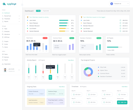 Apploye’s centralized dashboard provides detailed insights into total working hours, employee activities, frequently visited websites, and team performance. The platform also highlights top-performing employees based on activity percentage and working hours, fostering a culture of excellence and motivation.