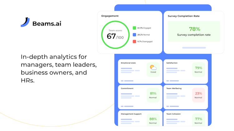Beams' key features include tracking employees' well-being with pulse surveys, team engagement analytics, personalized recommendations, and a gratitude network. Other features include: