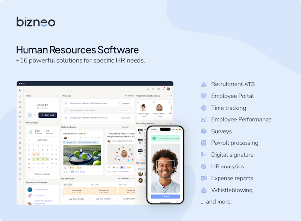 Bizneo HR is a software with more than 30 tools for self-management and operational optimization of: Recruitment, Absences, Time and Shift Control, Appraisals, Reports, Surveys, Training and more that you can customize in the portal of each worker.