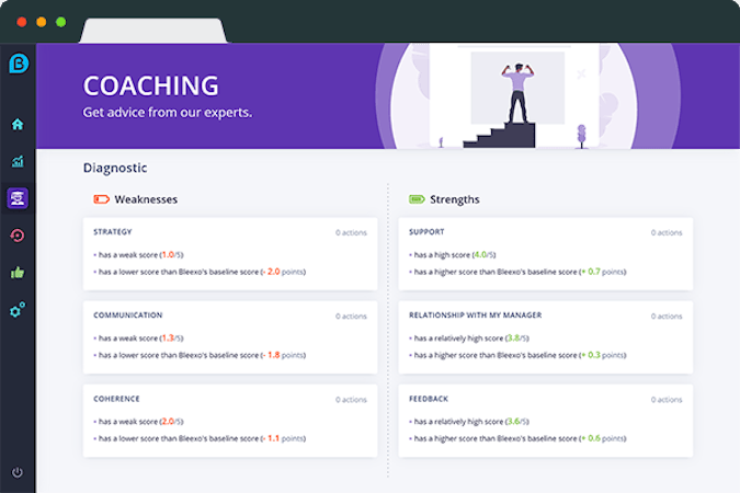 Bleexo offers coaching to help managers implement best management practices, and provides various other benefits such as real-time support, automated analytical reports, micro-learning, individual performance monitoring, practical guidance, and self-evaluation.
