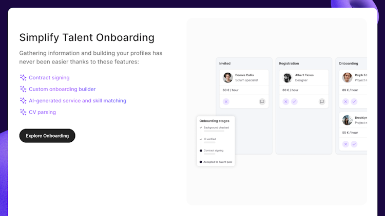 The tool provides a search option with filters and enables freelancers to keep their own profile information up to date. All hired workers can receive onboarding instructions via the platform.
