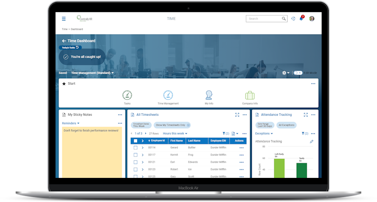 With multiple options to track time for non-exempt employees, including simple ways to punch in and out, adjust cost centers, and request time off from desktop, mobile, or a wall clock. Time is easily and accurately captured to seamlessly flow over to payroll. Exempt employees appreciate the accrual tracking and simple to use time off requests. Administrators love the leave of absence tracking and simple to use attestation prompts for state meal and rest breaks law compliance.