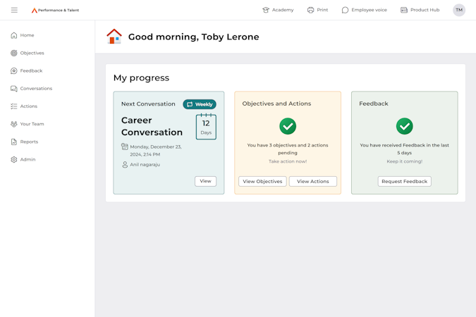 Tracking the performance and well-being of employees is often complicated, and it’s even more difficult to gather this information when you have a mix of working patterns, from multi campus to shift workers, from desk free to office and then there’s hybrid workers too. Fostering purposeful conversations between people and their managers is at the heart of our software. Enabling these conversations through Performance & Talent will drive engagement and embed your organisational culture and values in the workplace, wherever it may be.