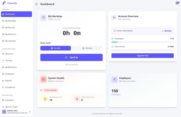 Cleverfy is a time tracking and work hour registration solution designed for small and medium sized enterprises. The platform enables organizations to satisfy current labor regulations and anticipate the new digital time tracking decree in Spain with minimal setup effort. The system addresses needs of businesses in hospitality, construction, retail, service and manufacturing sectors. The software replaces paper based and spreadsheet methods with a unified digital workflow that meets legal standards while preserving operational simplicity.