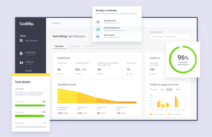 Since 2009, engineering hiring teams have been using Codility to attract, screen and interview candidates based on their real-life engineering and fundamental programming skills. The Codility assessment engine provides a clear signal as to which candidates are the most promising to advance based on technical skill. Hiring managers can use Codility to run remote live coding sessions with their candidates, all recorded and shareable directly via API or direct integration with your applicant tracking system.