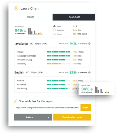 To ensure a fair test, CodinGame has put in place systems and processes to prevent and detect plagiarism. You can also anonymize candidates to prevent bias.