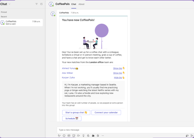 Managers can add the CoffeePals bot to a specific team in Microsoft Teams to match co-workers for weekly, bi-weekly, or monthly discussions. Users can streamline onboarding processes, cross-department meetings, mentorship programs, and more. The platform can also post various topics and questions to a team’s channel, allowing employees to discuss them through text.