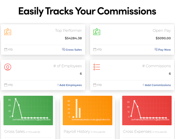 Commission Pay Pro's built-in dashboard enables business leaders to gain insights into top-performing employees, gross expenses, payroll history, gross sales, and overdue payments.