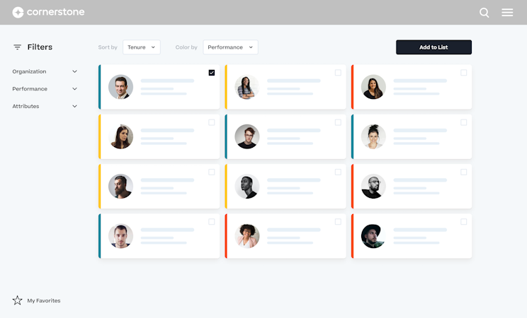 Cornerstone provides a robust overview of your peoples' super-strengths so you can continuously improve employee performance, productivity, and engagement. A comprehensive skills library, development plans, and intuitive data visualizations help you assess and boost employee capabilities.
