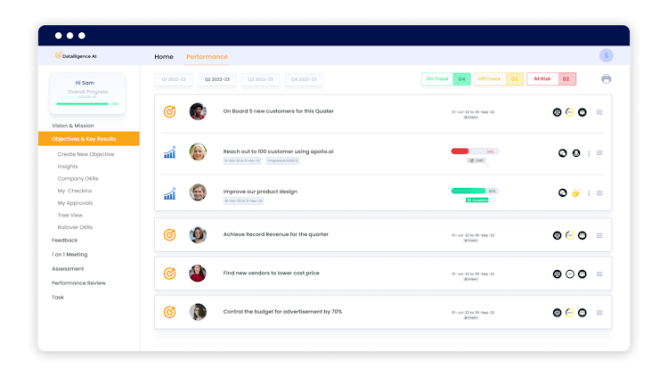Datalligence offers an OKR software that fosters a performance-driven culture for organizations of any size, whether they are a startup or established enterprises. Our software enables you to monitor and assess progress in real-time while visualizing alignment across your team. By using our platform, you can effectively translate your organization's strategies into actionable and measurable goals, effectively communicating your purpose through attainable milestones.