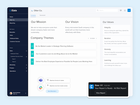 Support data-driven decision making through Elate's dashboards, performance indicators, risk scoring, and sentiment analysis from team updates.