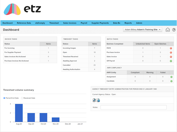 ETZ is a software solution for recuirment agencies that automates the back office workflow to make sure more time is spent on clients, than on paperwork. ETZ can generate an invoice from a timesheet submission and create a seamless process for a new hire to begin their career while getting paid on time. ETZ is integrated with accounting systems such as Xero and Quickbooks, which enables calculated invoices to be emailed directly to the client along with copies of signed timesheets.
