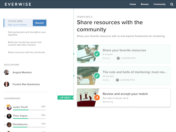 With Everwise businesses can create online mentoring programs for building business leaders, fostering personal connections, and more, and onboarding courses for mentors and mentees can also be created. Mentors can be matched with mentees using three different approaches which include matching by management, hybrid matching with requests from mentees but decisions by management, and self matching where mentees are able to choose their own mentor based on Everwise recommendations.