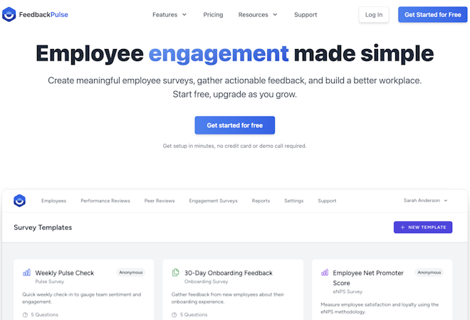 • Free plan included: Teams up to 10 employees use FeedbackPulse free forever. No credit card required.
