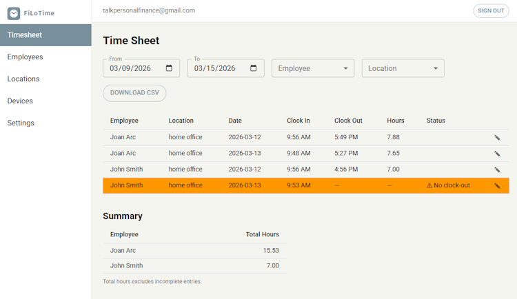 The timesheet dashboard provides filtering by employee, location and custom date ranges. Administrators can view total hours and shift summaries at a glance and export data to a comma separated value file for payroll processing. Employee management features allow administrators to add workers, assign PINs and activate or deactivate access with immediate effect across all registered devices. Device management controls support terminal registration with one-time activation codes and permit renaming or revocation of device access through the administrative dashboard.