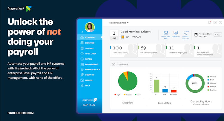 Fingercheck is a human resource (HR) management platform that helps businesses manage employees’ payroll, benefits, or insurance and streamline the entire recruitment lifecycle, from applicant tracking to onboarding. Managers can track employees’ attendance and working hours using time clocks, biometric fingerprints, mobile applications, text or web punch-ins, and facial recognition technology.