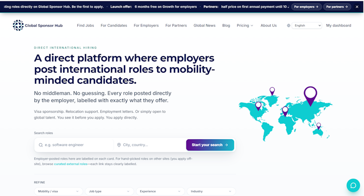 Global Sponsor Hub is a direct hiring platform designed for international job placement and global workforce mobility. The platform serves as a marketplace where employers post roles directly for candidates requiring visa sponsorship, relocation assistance or remote work arrangements across borders. Unlike conventional job boards that aggregate listings from multiple sources, the platform focuses on connecting internationally mobile candidates with employers prepared to support cross-border hiring. The system addresses distinct user groups including job seekers needing mobility support, employers seeking global talent and immigration or relocation service partners offering assistance throughout the hiring and relocation process.